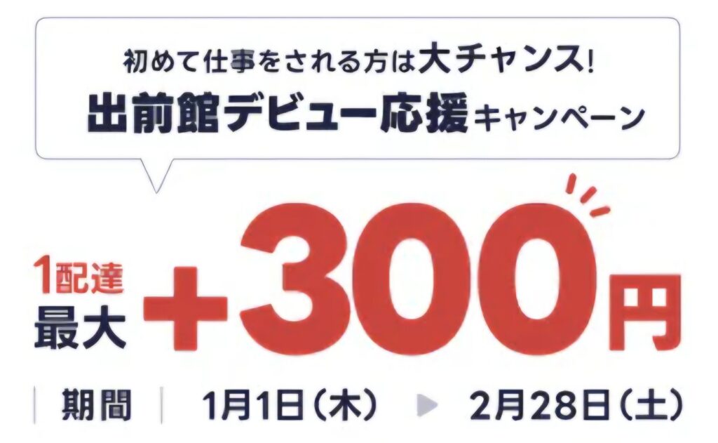 最低400円からなので、出前館デビュー応援キャンペーンで+300円だと最低700円という高い報酬額です。