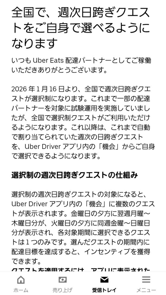 2026年から、全ての配達員に選択制クエストが始まりました。