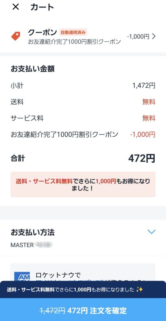 すると、以前にお友達紹介キャンペーンでもらえた1,000円クーポンが適用されました。
