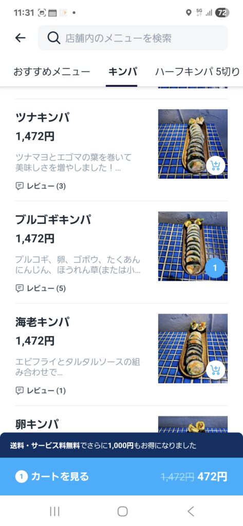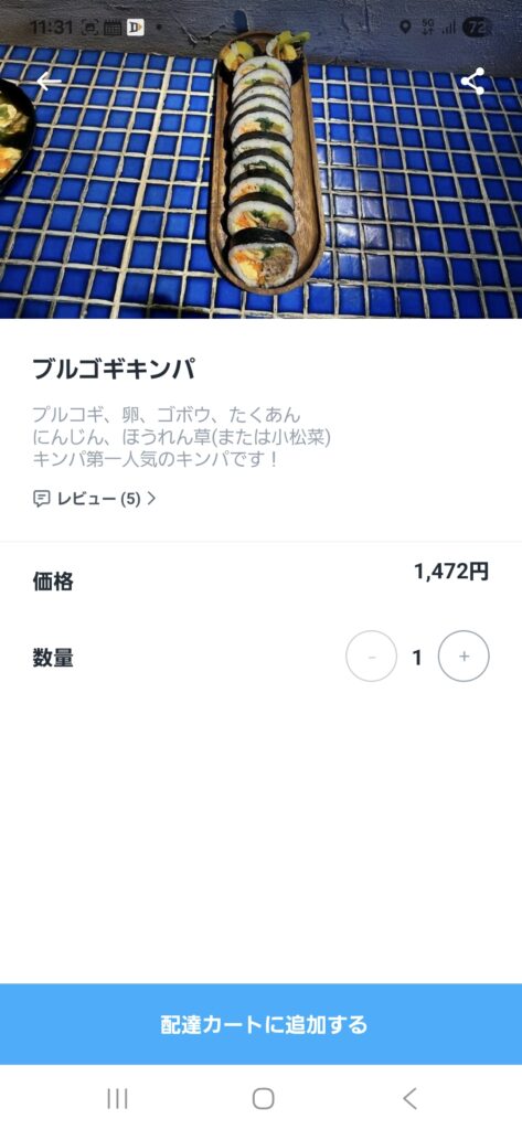 人気の商品の『プルコギキンパ』を注文しました。商品は、こんな感じです↓