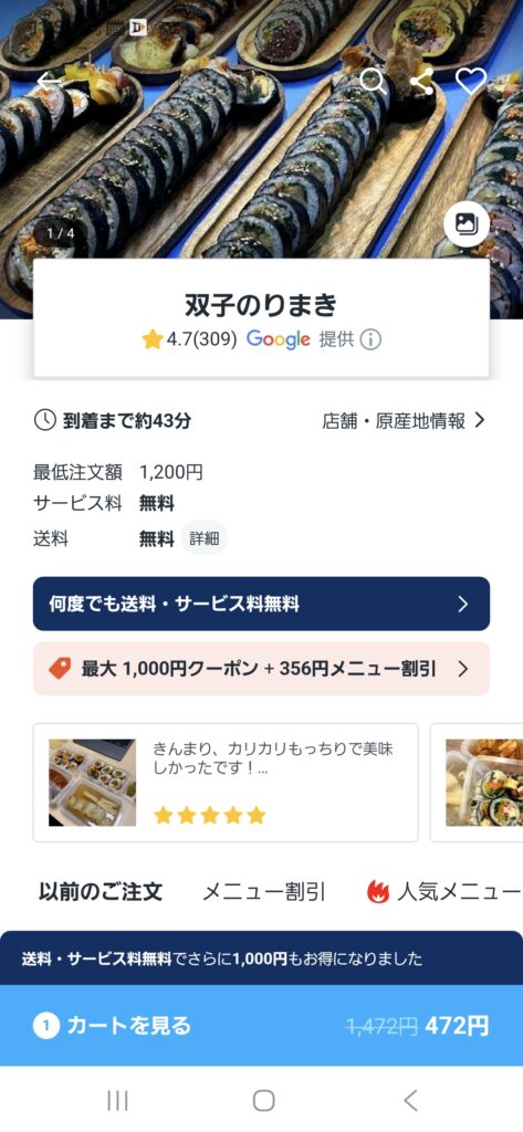 ウーバーイーツや出前館と比べると、安く頼めます。