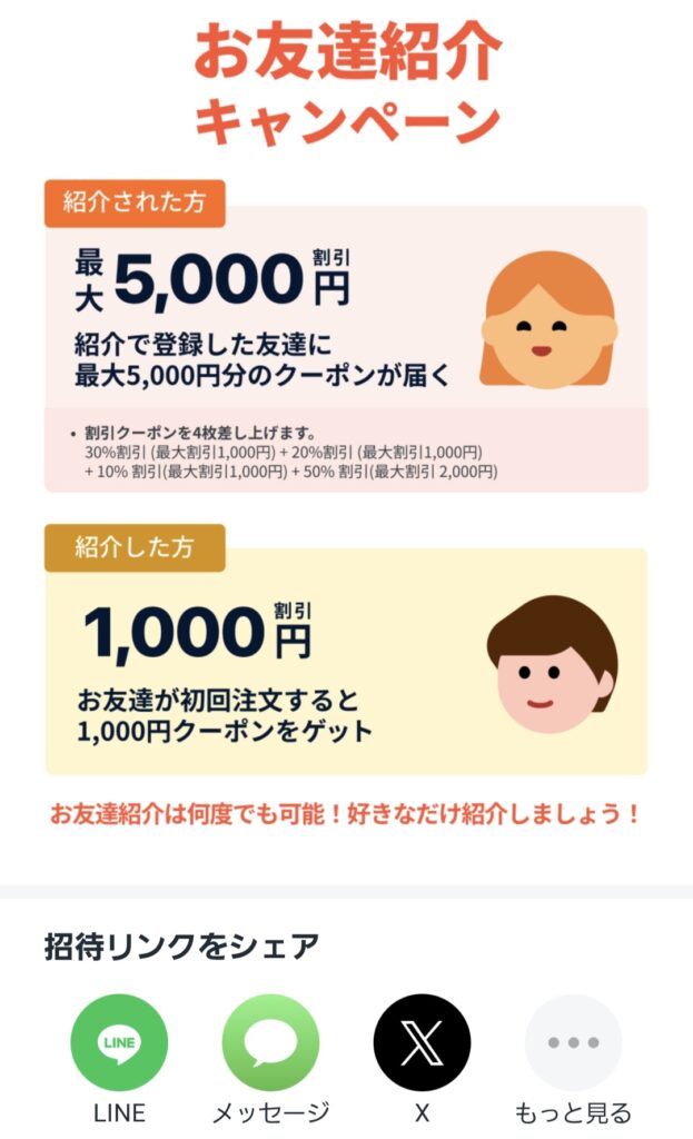 お友達が初回注文すると、1,000円クーポンをゲットできます。
