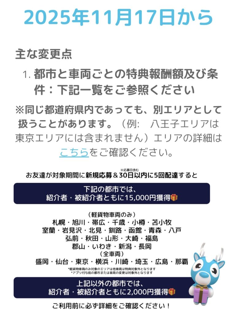 注意すべきは、『応募後30日以内』です。これはつまり、応募して翌日にアカウント有効になるとは限らないので、配達できるまでに5日間、長ければ何かの原因で1週間以上なども考えられます。30日の猶予はありますが、配達できるようになったら(アカウント有効になったら)15回の配達は速攻で終わらせて、まずは紹介料をゲットしましょう!!