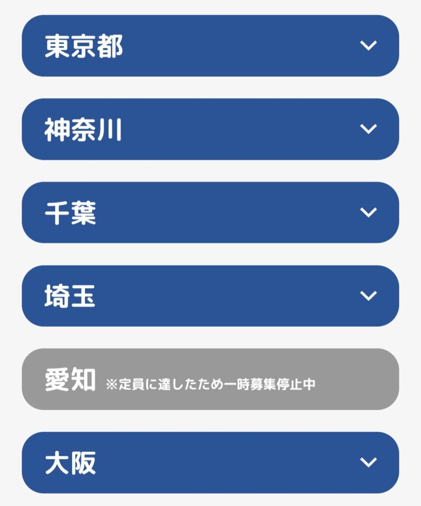 でも怪しくない?そんなうまい話ウソでしょ?と思いたくなるので、内容をご紹介していきます。ちなみに、人気なので、既に『愛知』エリアは定員に達したため、現在は一時募集停止中です。他エリアの東京、神奈川、埼玉、千葉、大阪は募集中なので、早い者勝ちですよ!